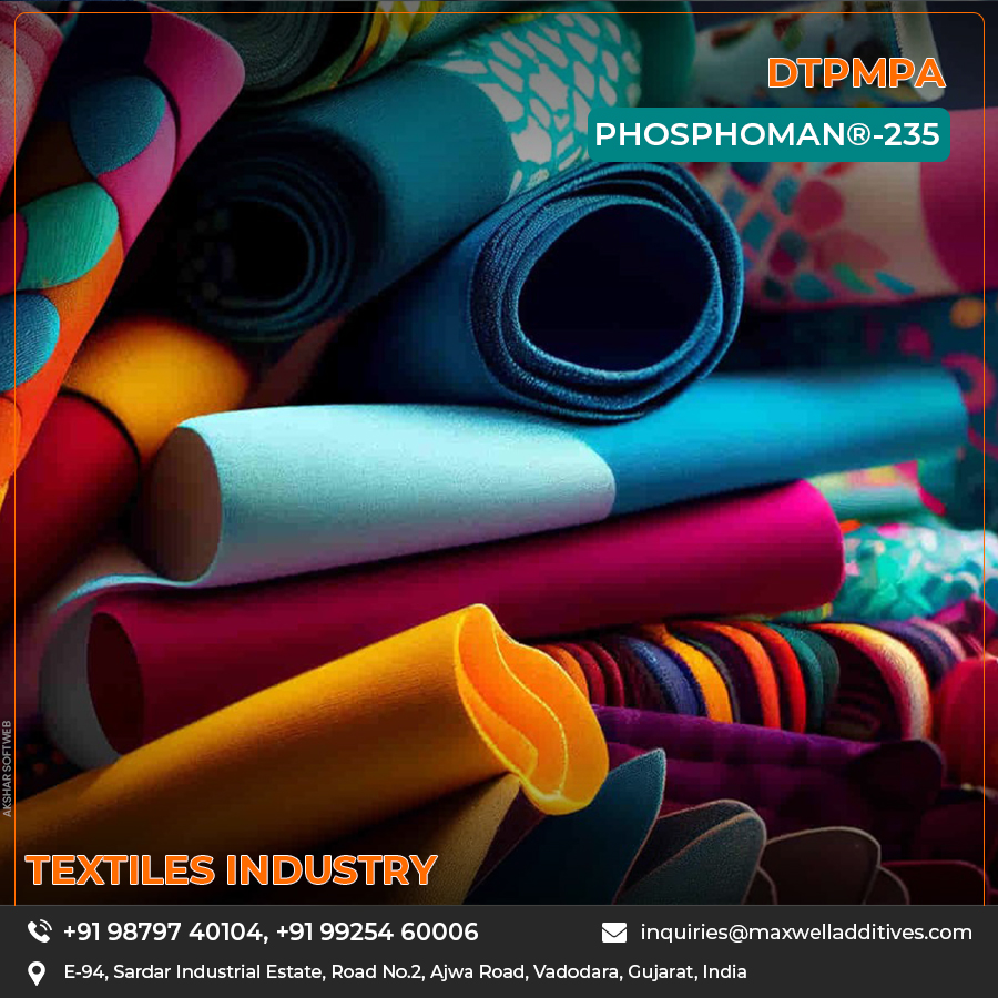 DTPMP controls hardness ions in water to improve dye quality, ensures even color shades, reduces scale buildup in machines, and enhances cleaning chemicals used in textile wet processing.